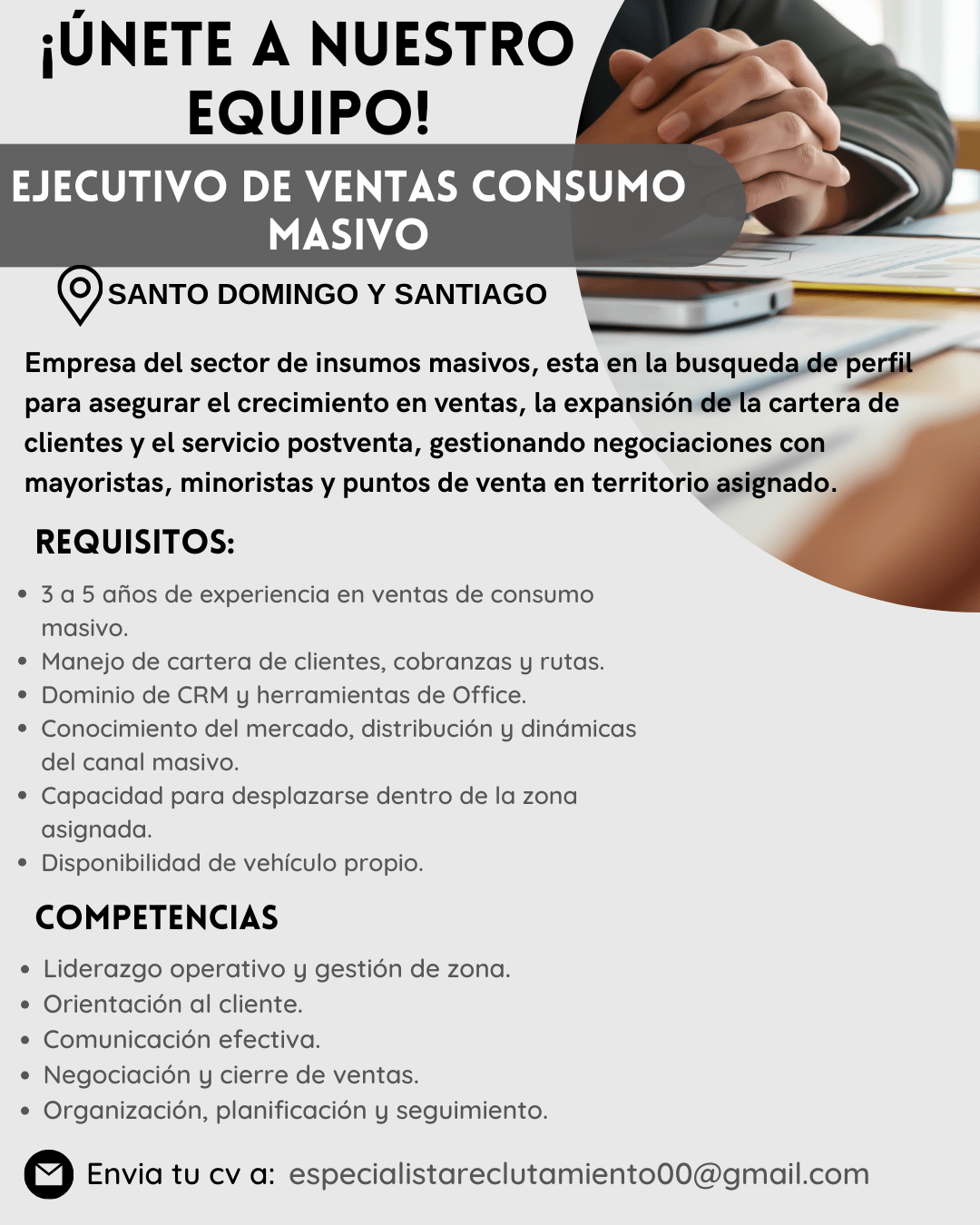 Ejecutivos de Ventas para el área de consumo masivo. El objetivo del rol es asegurar el crecimiento en ventas, la expansión de la cartera de clientes y garantizar un servicio postventa eficiente, gestionando negociaciones con mayoristas, minoristas y puntos de venta en el territorio asignado