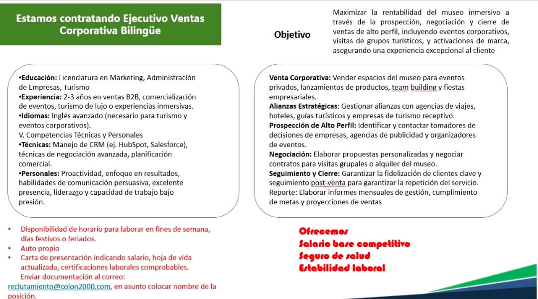 Experiencia: 2-3 afos en ventas B2B, comercialización de eventos, turismo de lujo o experiencias inmersivas. •Idiomas: Inglés avanzado (necesario para turismo y eventos corporativos).