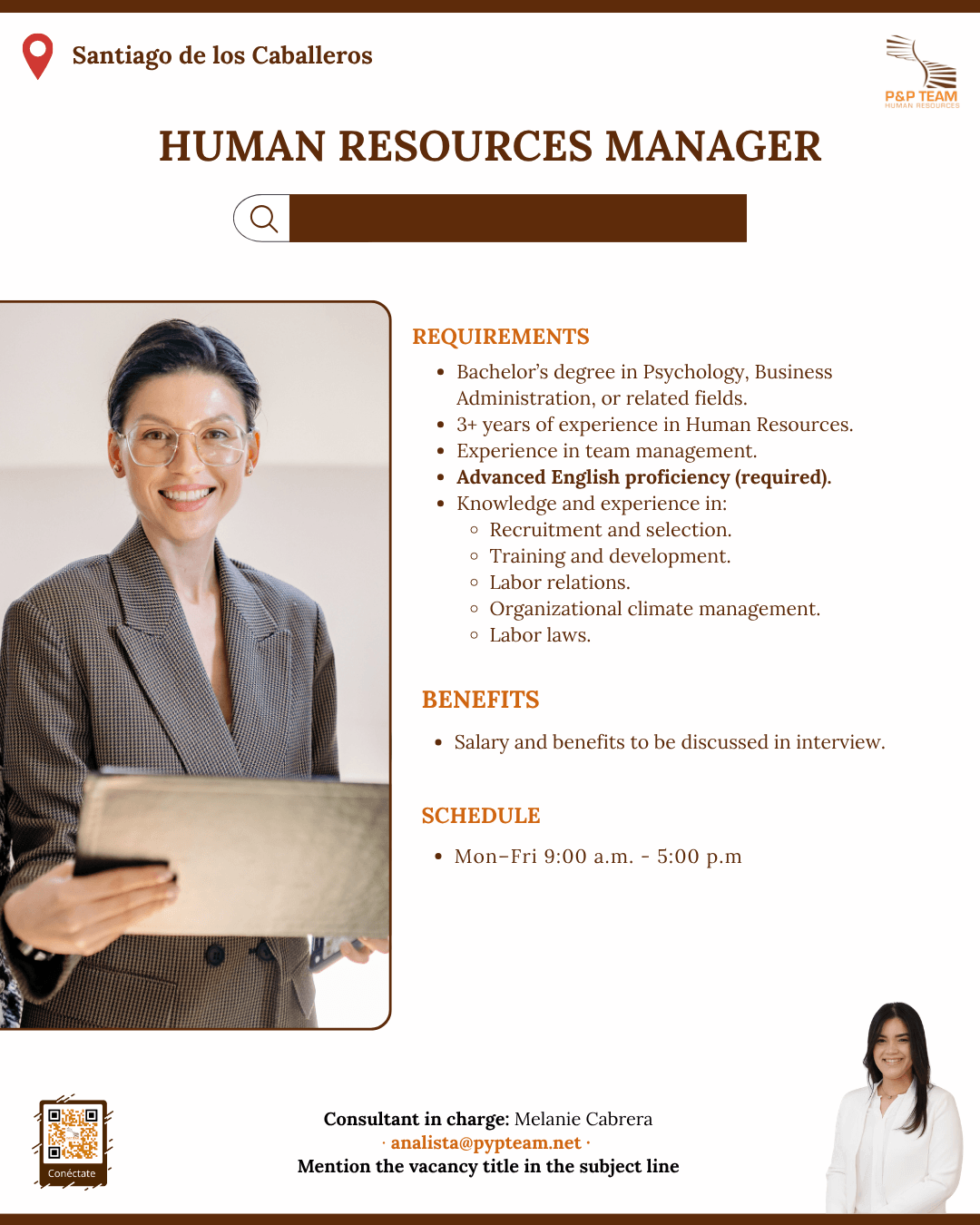 Responsible for managing processes related to the company’s human talent, including recruitment and selection, onboarding, personnel file management, labor relations, and supporting compliance with human resources policies and standards.