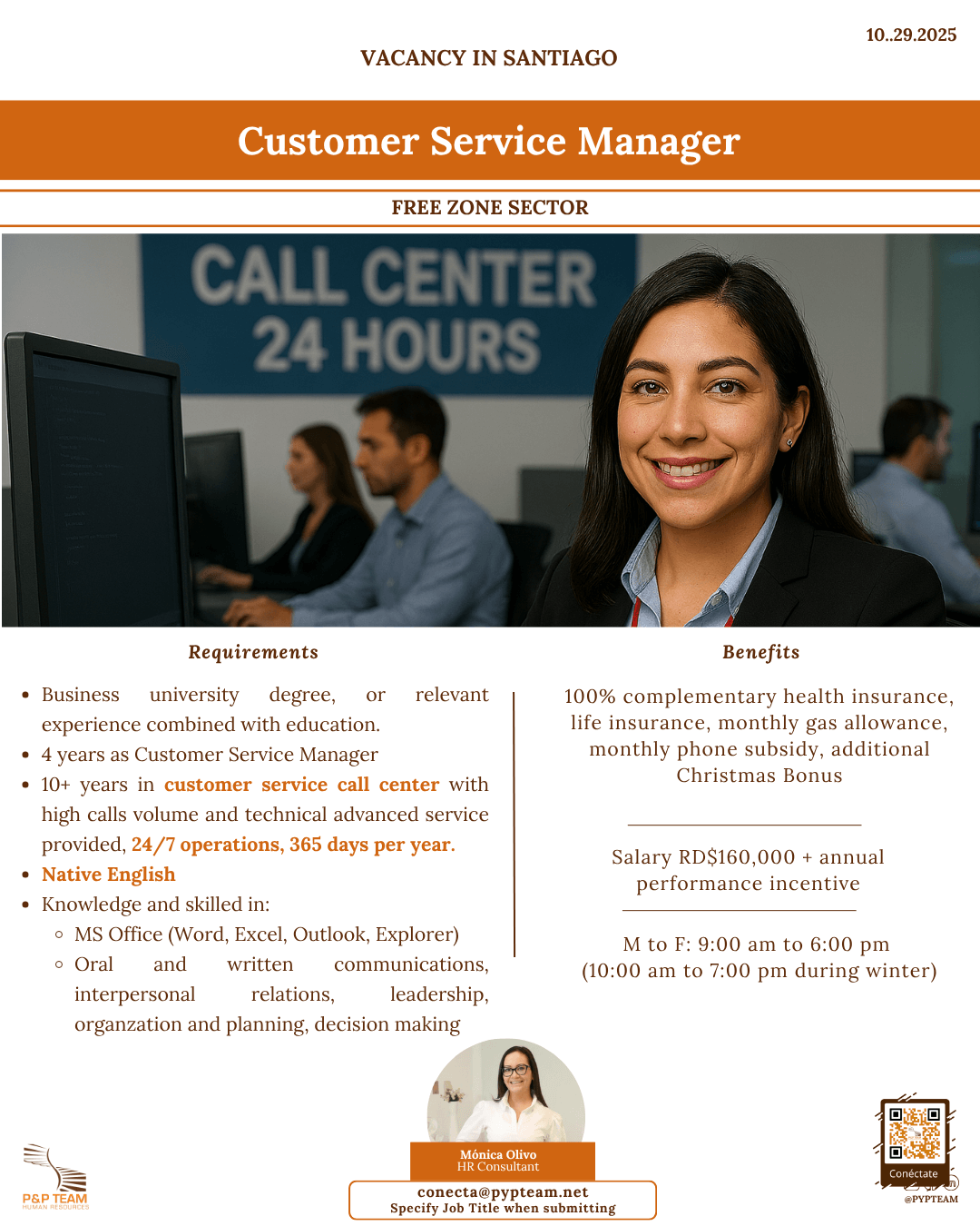 • At least ten (10) years’ management experience in a high-volume, technically advanced 24/7/365 inbound customer care call center