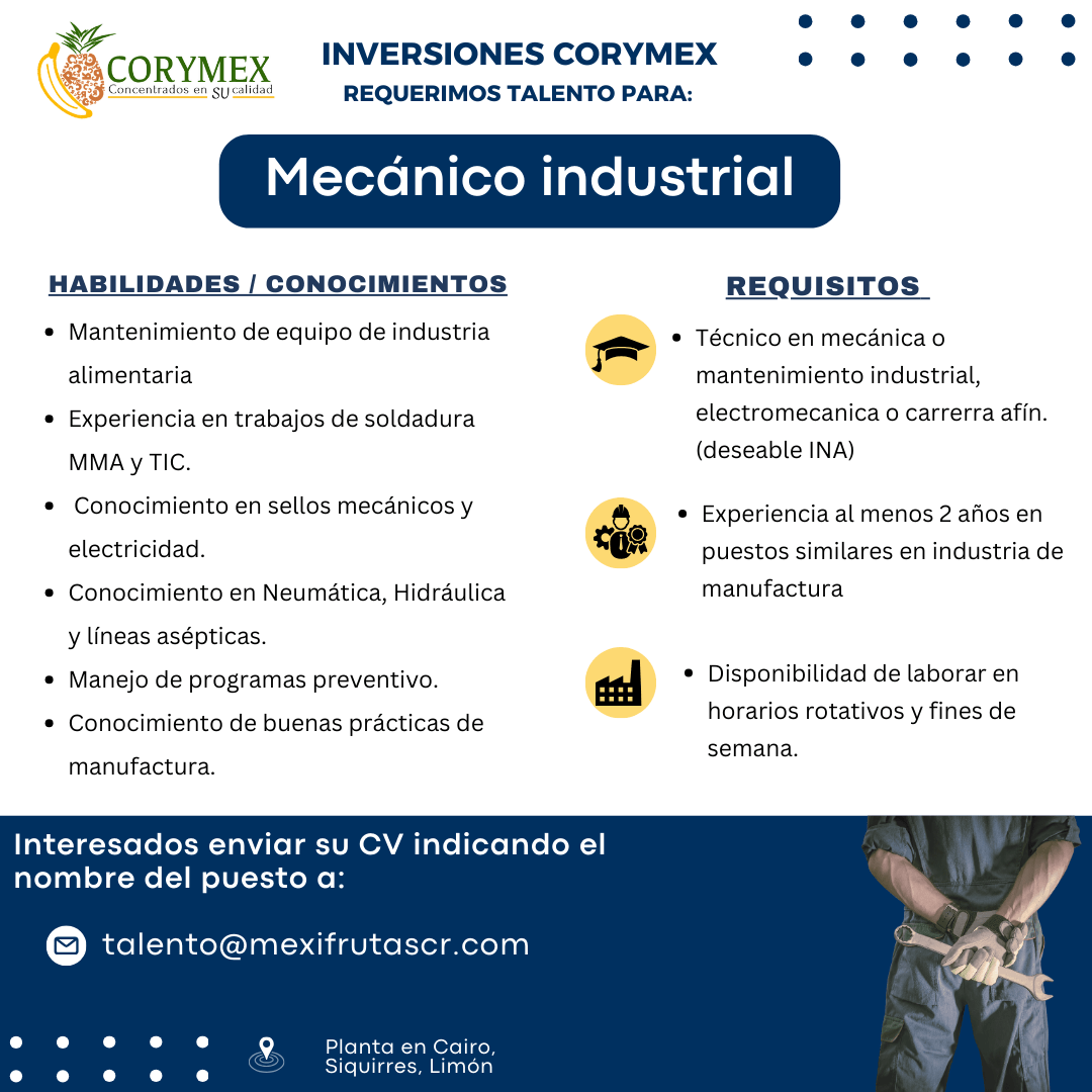 Conocimiento de equipos de distintas marcas para realizar soluciones prontas, experiencia en industrias alimenticas. Conocimiento básico en soldadura en MMA y TIC. Conocimiento en sellos mecánicos, sistemas de vacío,sistemas neumáticos, sistema hidráulicos, líneas asépticas y llenadoras asépticas.