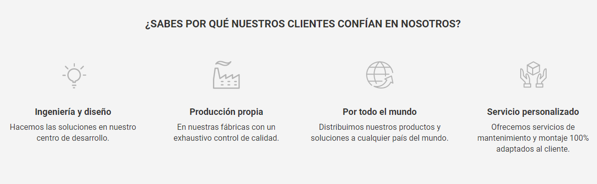 Gassó Equipment es una empresa de fabricación y distribución de soluciones integrales para la industria. Actualmente comercializamos nuestros productos a más de 90 países diferentes con clientes líderes en sus sectores, adaptándonos a la normativa y casuística de cada territorio. Ofrecemos un servicio integral al cliente: diseño, fabricación, transporte, instalación y mantenimiento del producto.